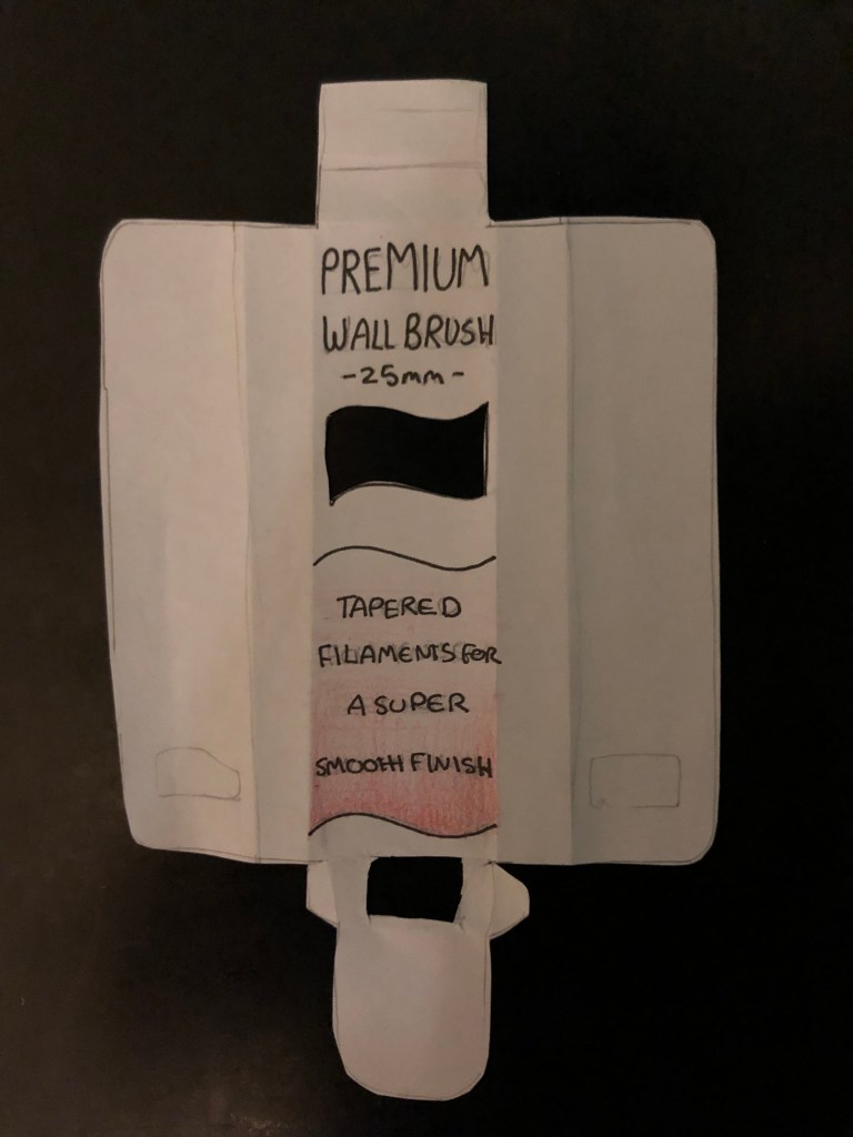 4. I then worked on prototyping, working with the key points I wanted to fix, from the initial analysing of the brush. These were; adding an open window so the customer can touch the bristles, simplifying the design – hence making it sleeker and more modern, using the buzz words on the back of the brush (such as ‘Tapered filaments for a super smooth finish’ which makes it sound more prestigious and professional). I also decided to keep the red and yellow colour scheme, as it is eyepopping and bold, hence giving the small product solid shelf presence.