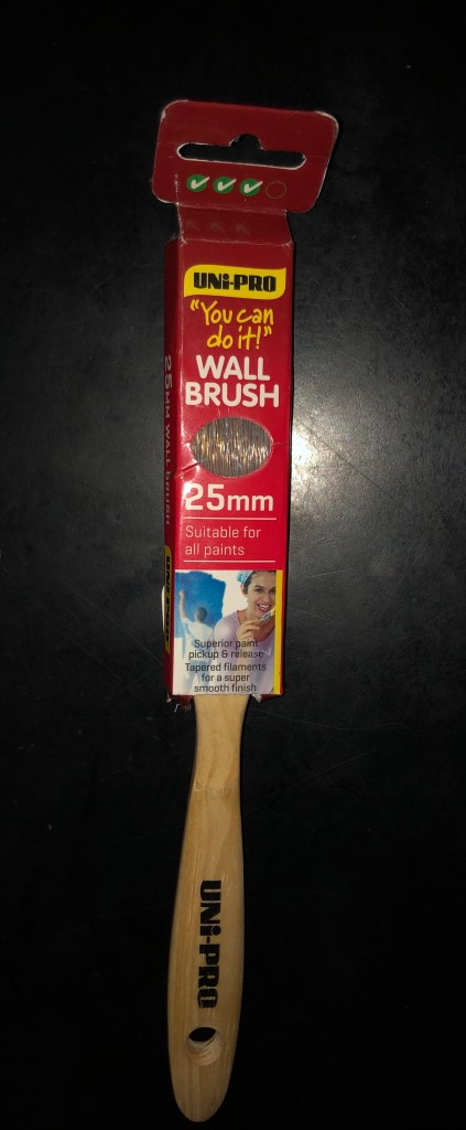 1. I bought a $3.90 ‘wall brush’ by Uni-Pro. I then examined the other paintbrushes on the shelf around it. Focusing on the expensive brushes, to figure out what the competition is and how I can give my re-design the design face lift.